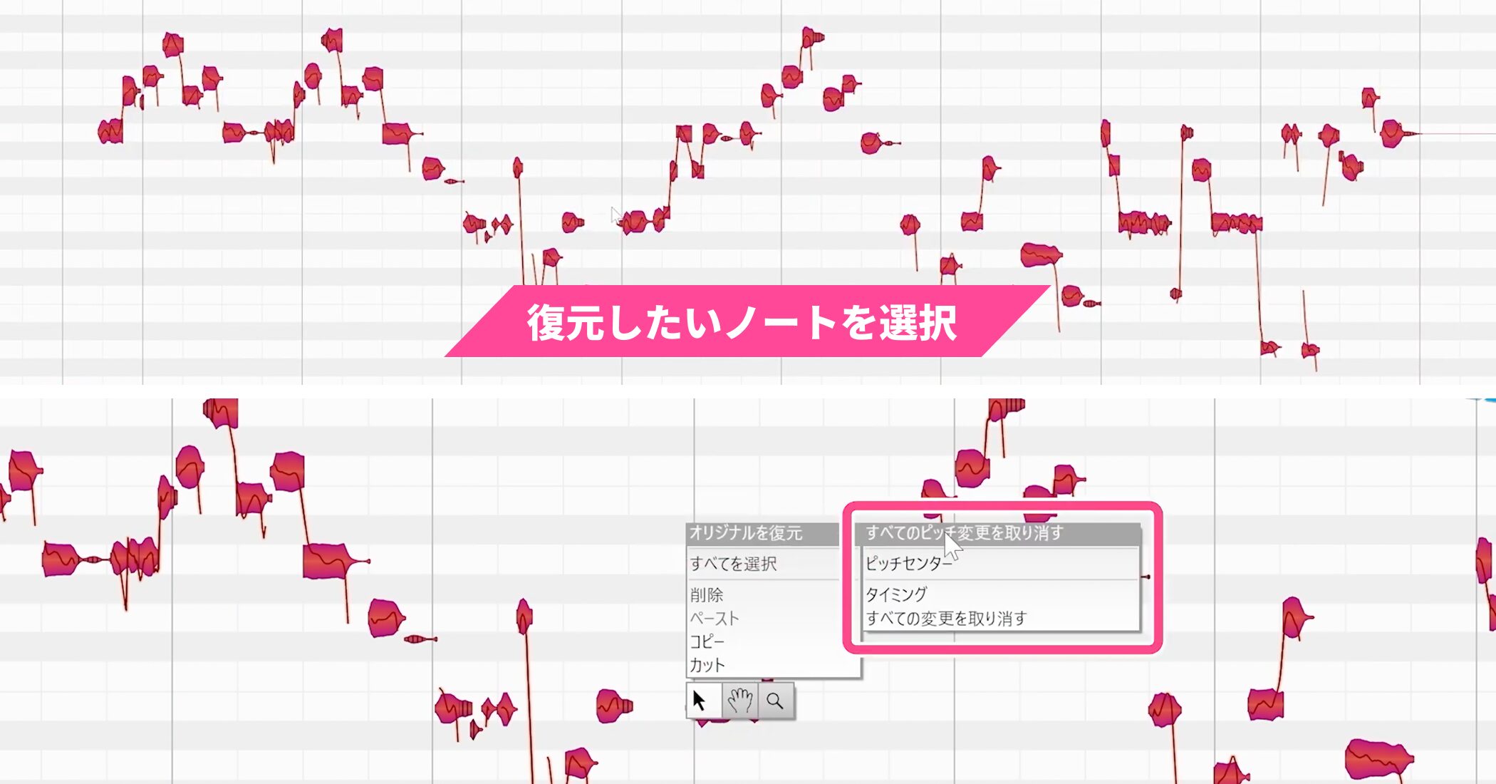 補正結果の一部または全体を元に戻したい場合は、戻したいノートを選択して右クリックし、一番上の「オリジナルの復元」からピッチ、タイミング、もしくはすべての変更を戻すかを選択できます。