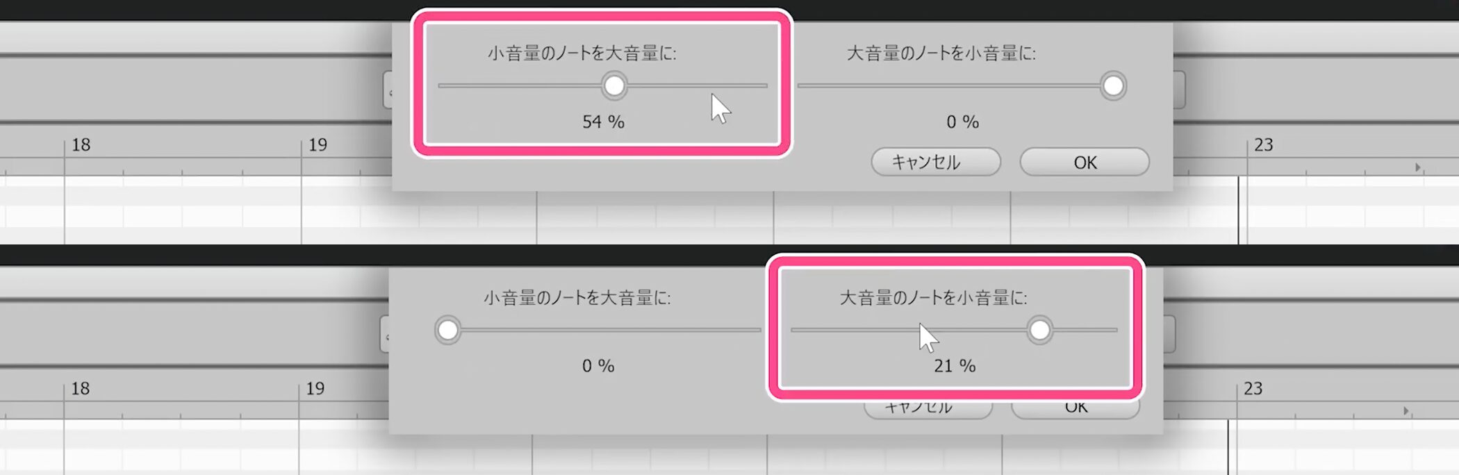 ボリュームを補正する場合は、補正したいノートを選択して右端にあるボタンをクリックします。