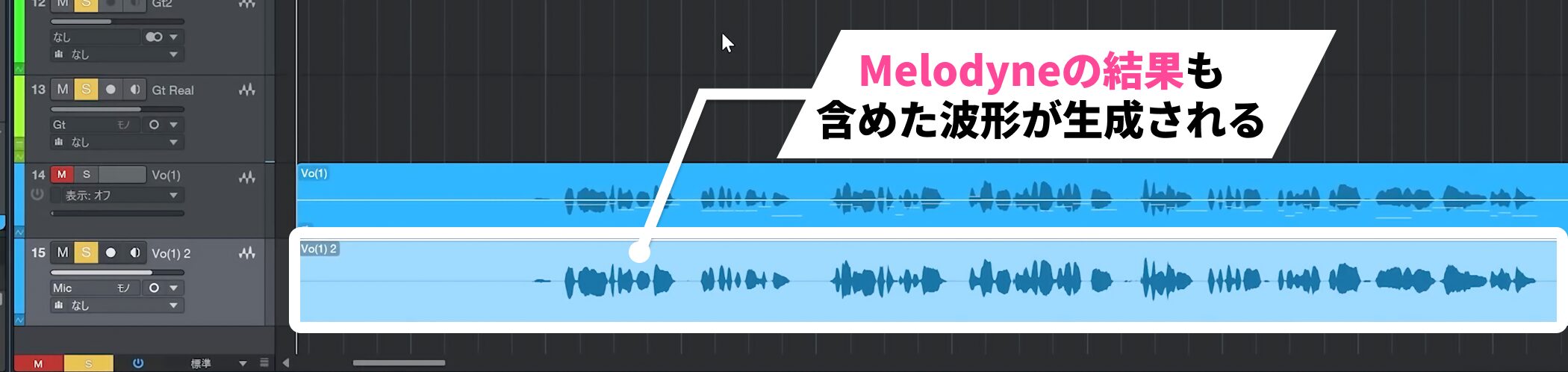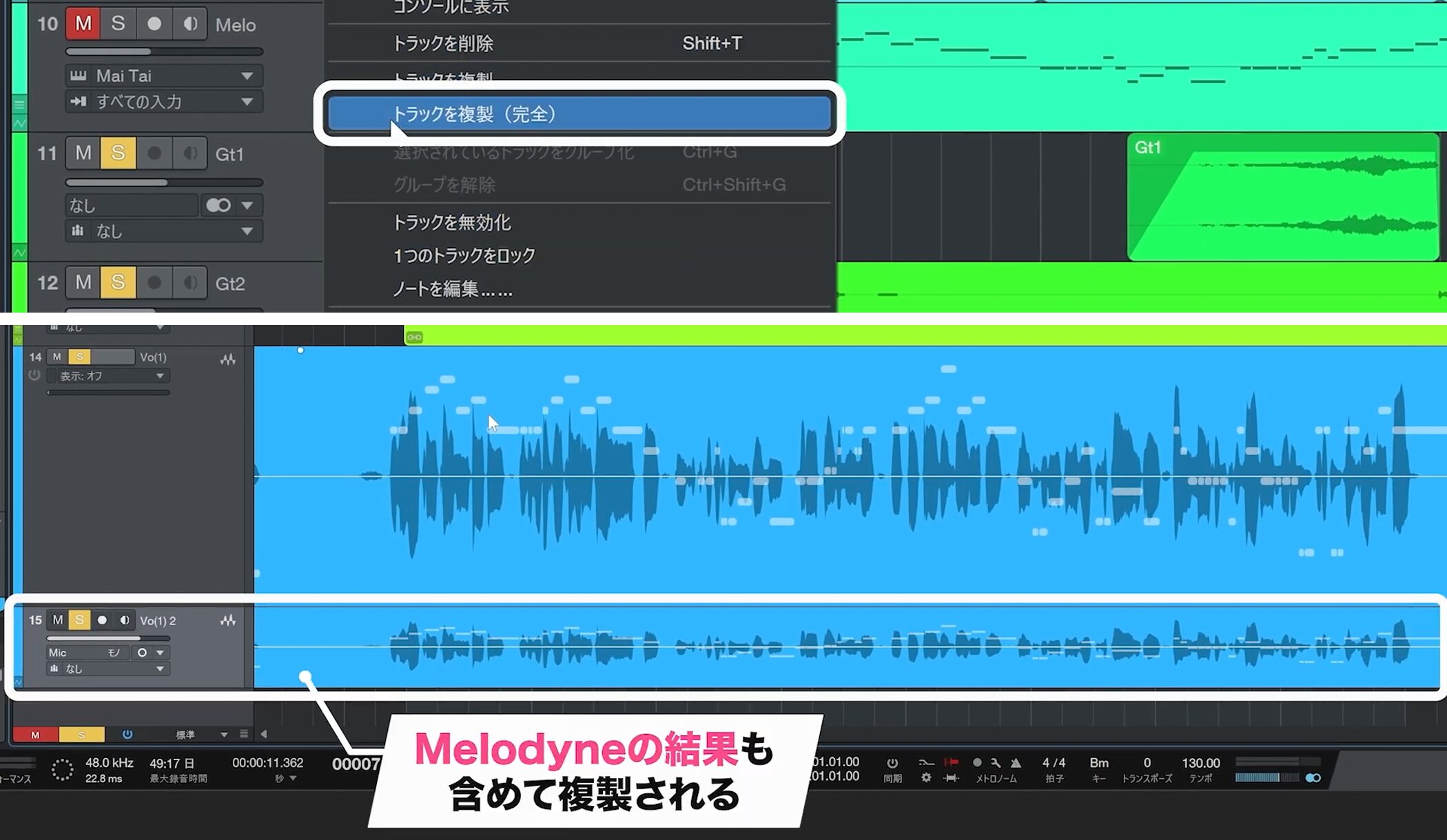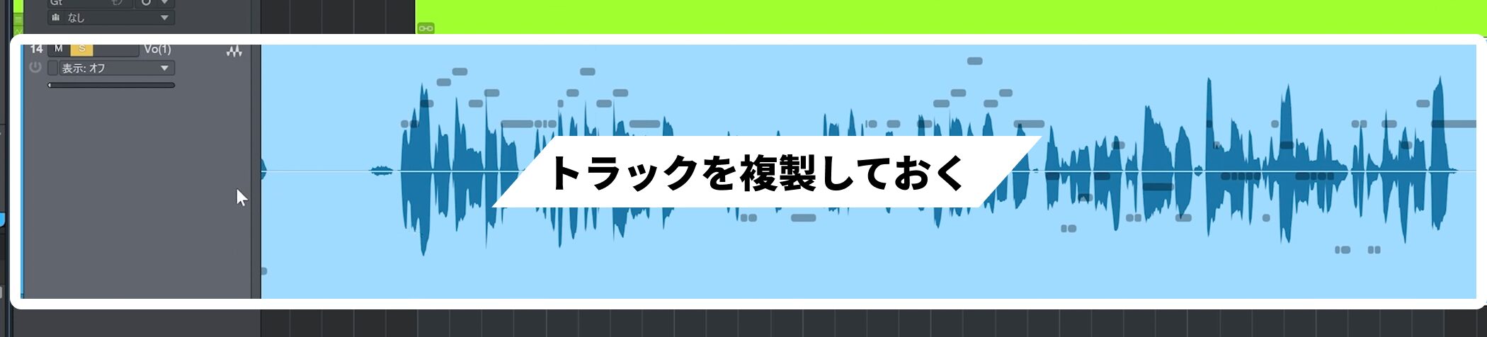 また、オーディオで書き出してしまうと、Melodyne Essentialの編集に戻って再度エディットを行うことができなくなってしまうため、まずはトラックを複製しておくことをおすすめします。