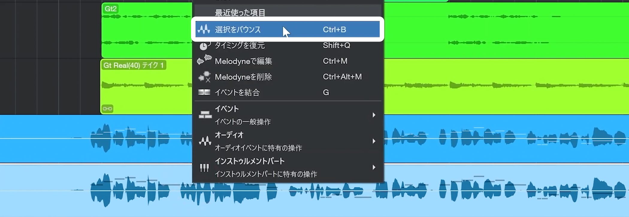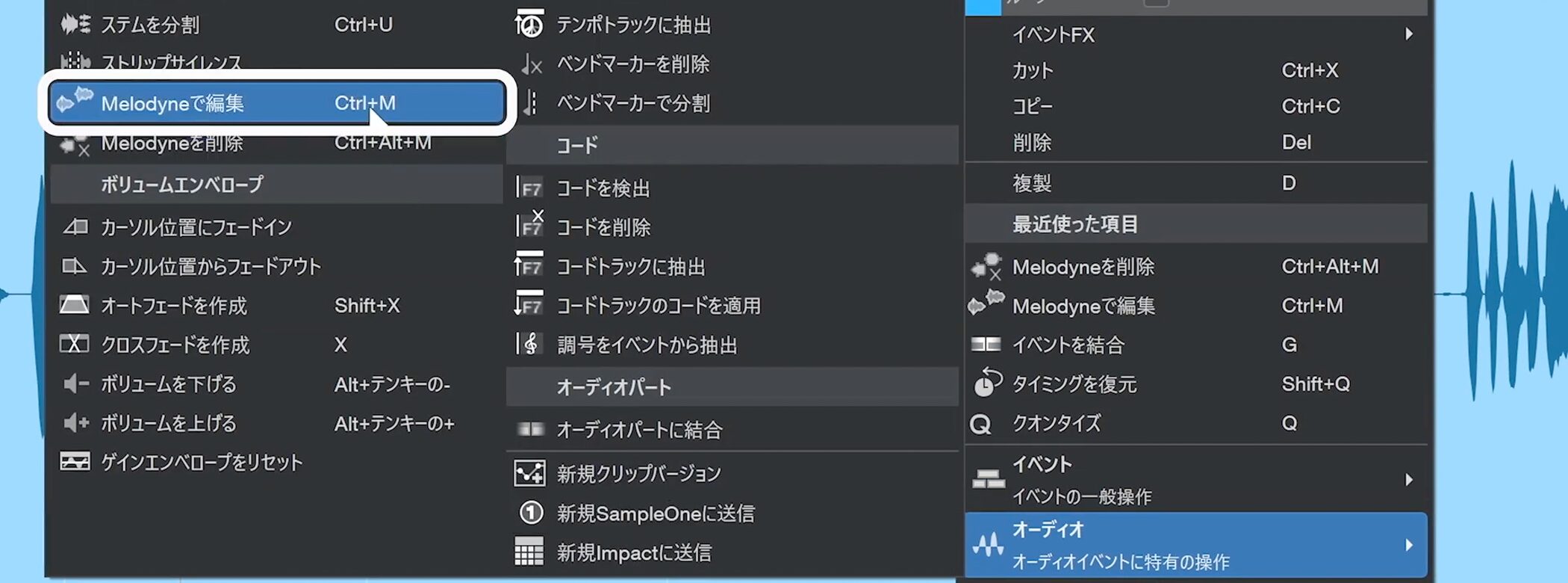補正したいオーディオイベントを右クリックして、「オーディオ」の中から「Melodyneで編集」を選択します。