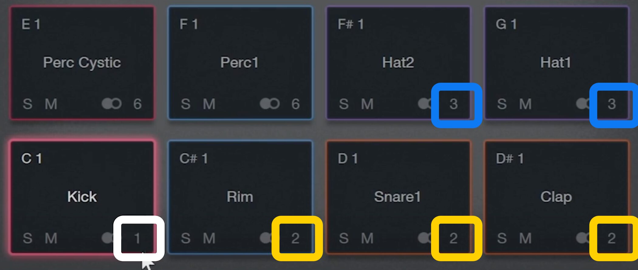 したがって、2番や3番といった他の出力先を設定することで、キック以外のサウンドも個別にコントロールできるようになります。