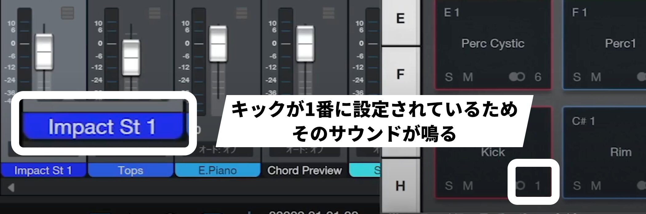 キックが1番に設定されているため、そのサウンドが鳴る仕組みになっています。
