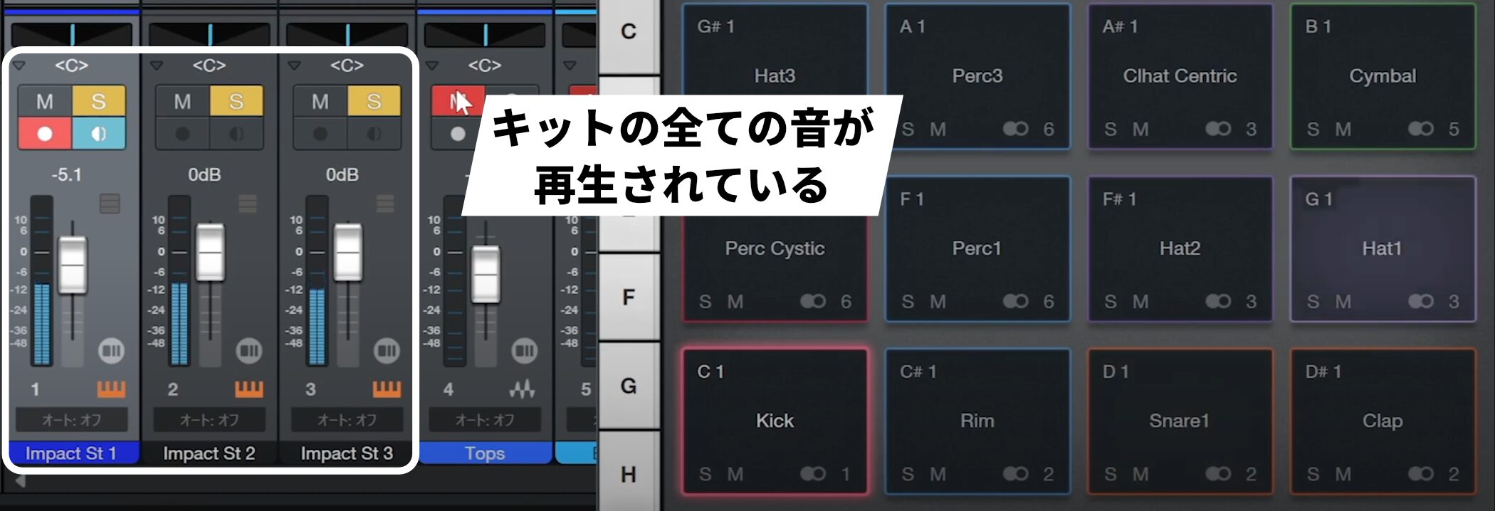 3トラックをソロにして再生すると、今回使用しているキットの全ての音が再生されます。