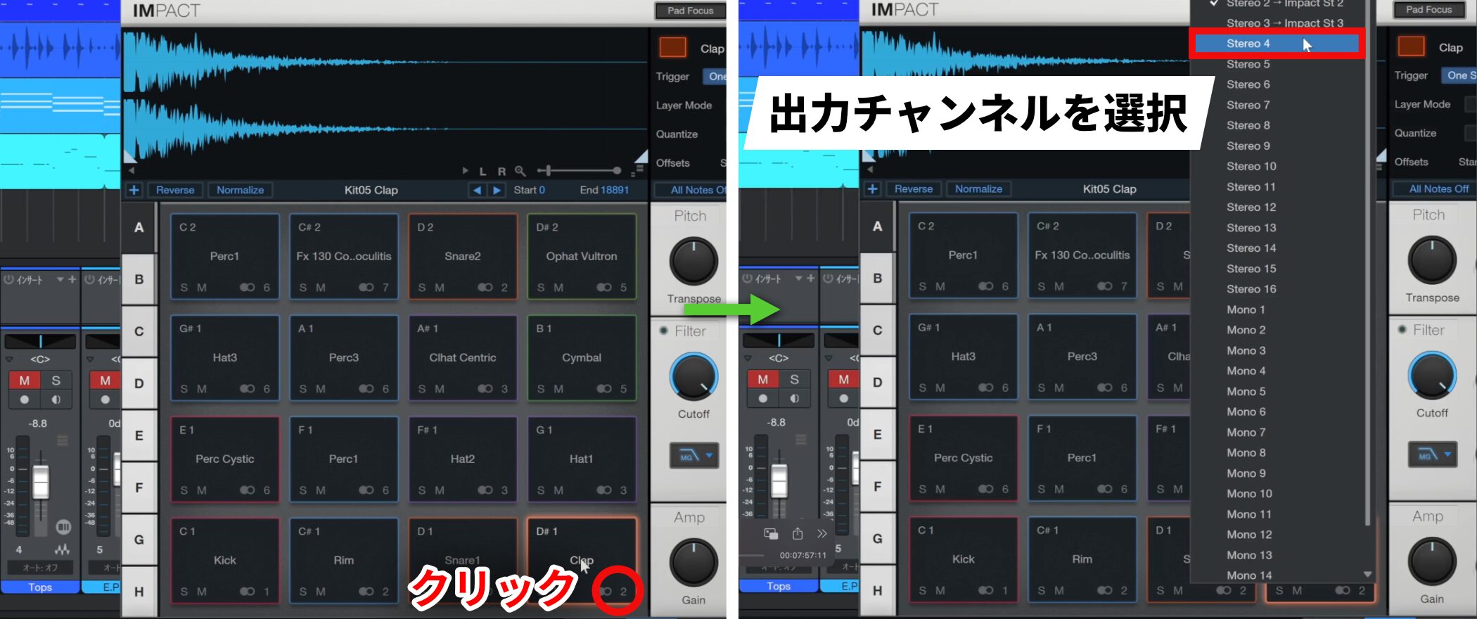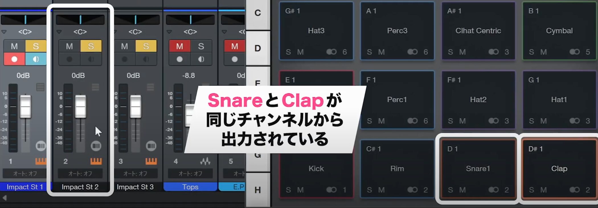 スネアの2番はそのまま維持し、クラップの出力チャンネルを変更します。