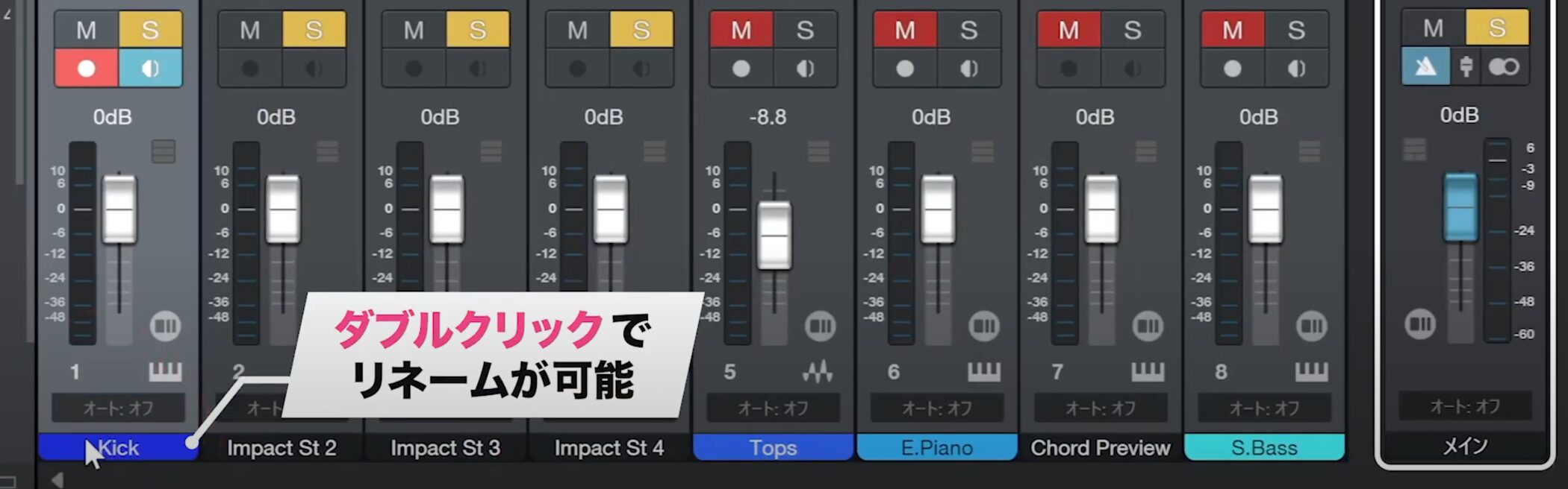 各トラックのチャンネル表示部分をダブルクリックすると、通常のトラックと同様にリネームできるため、名前を付けておくとさらに便利です。