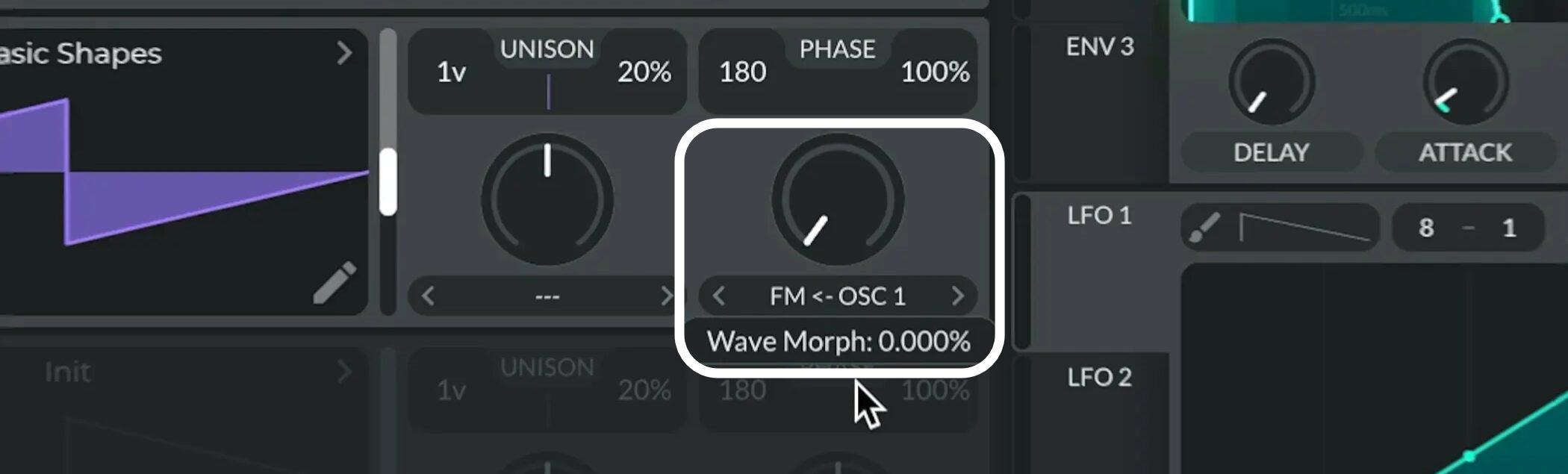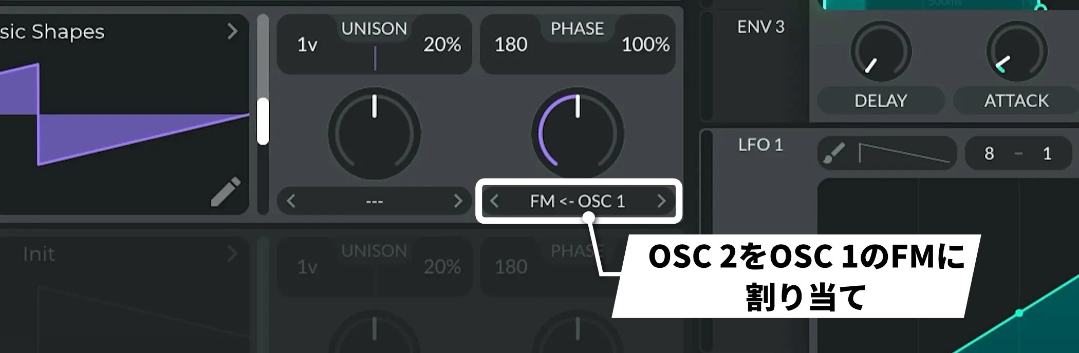 ここではFM変調を使うので、OSC2をOSC1のFMに割り当てます。