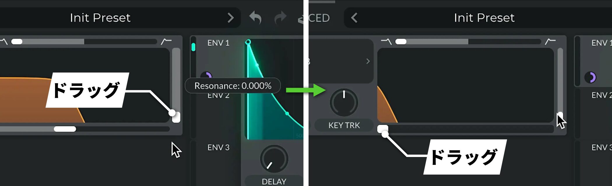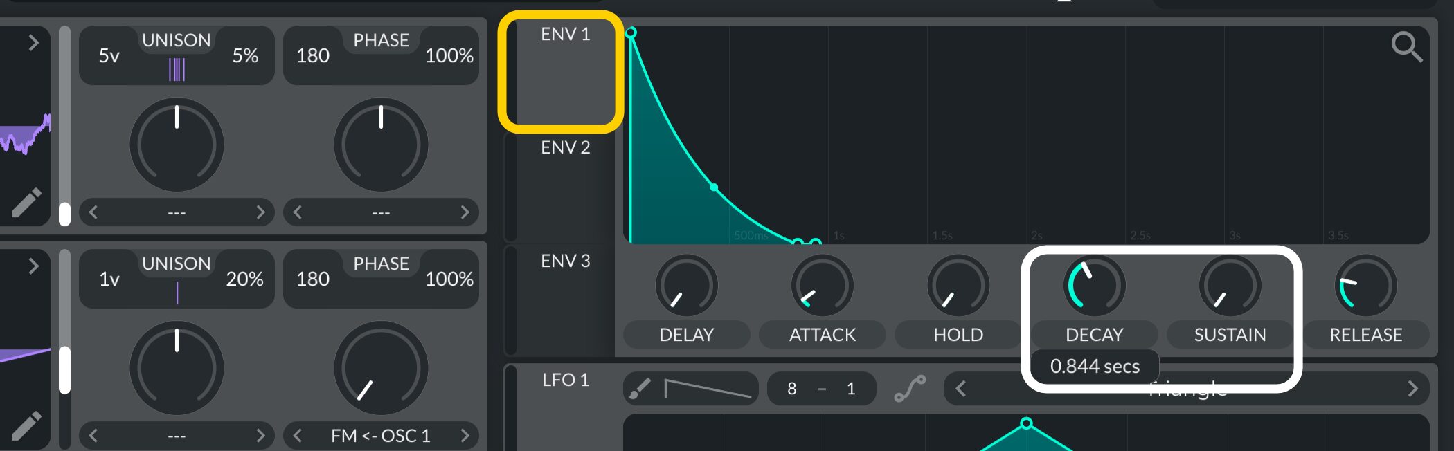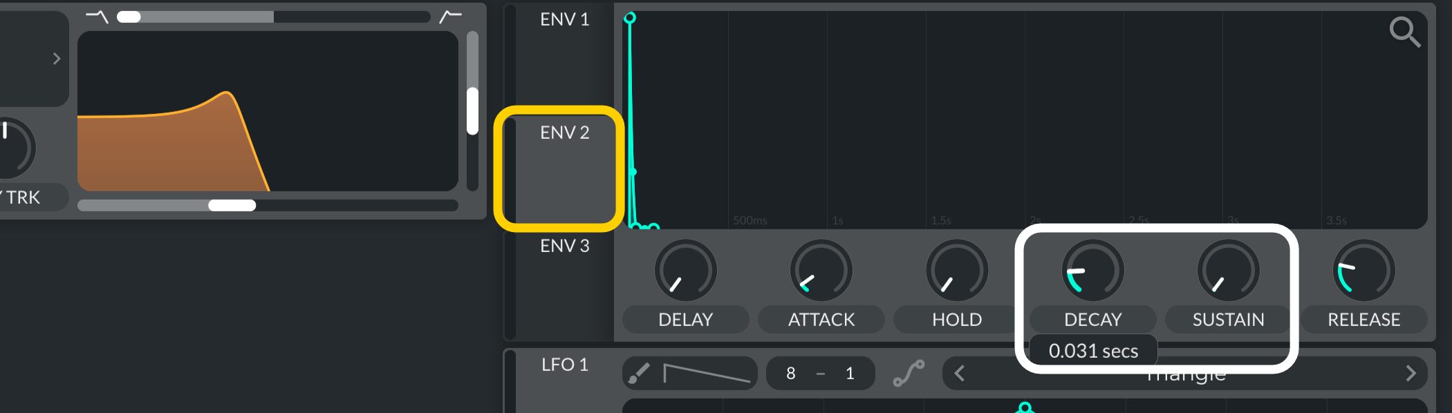 次にスラップベース特有の力強いアタック感を加えるために、ENV2を下記のとおり設定します。