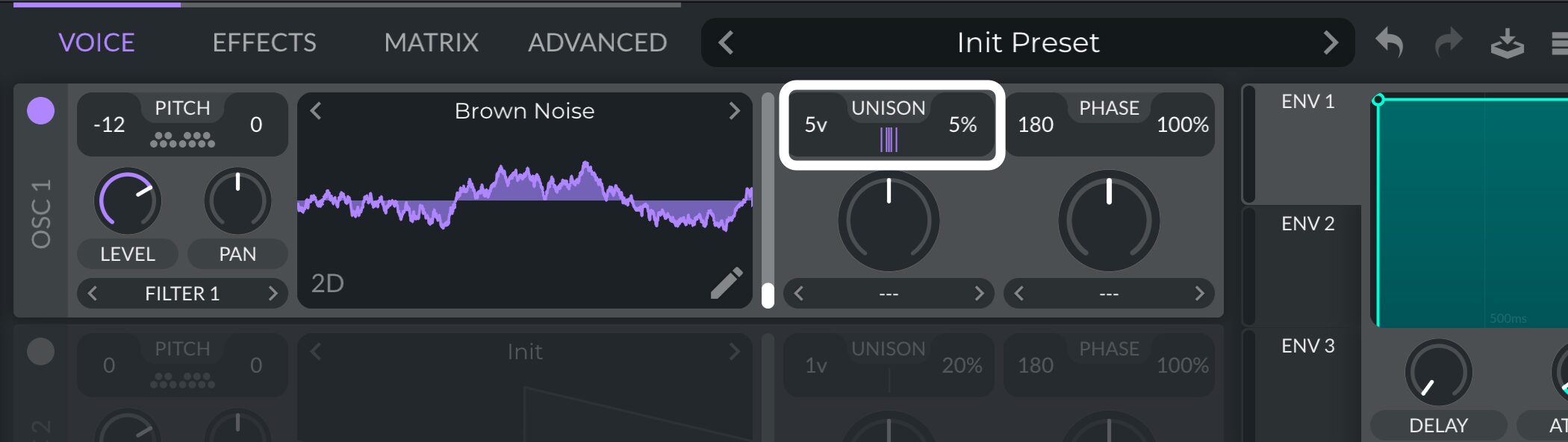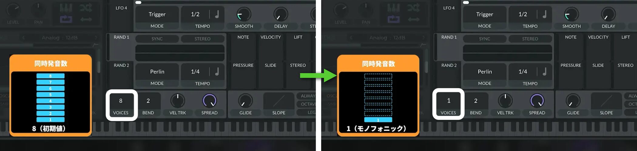 まずはモノフォニックのベース音源なので、事前にVOICES(同時発音数)を1に設定します。