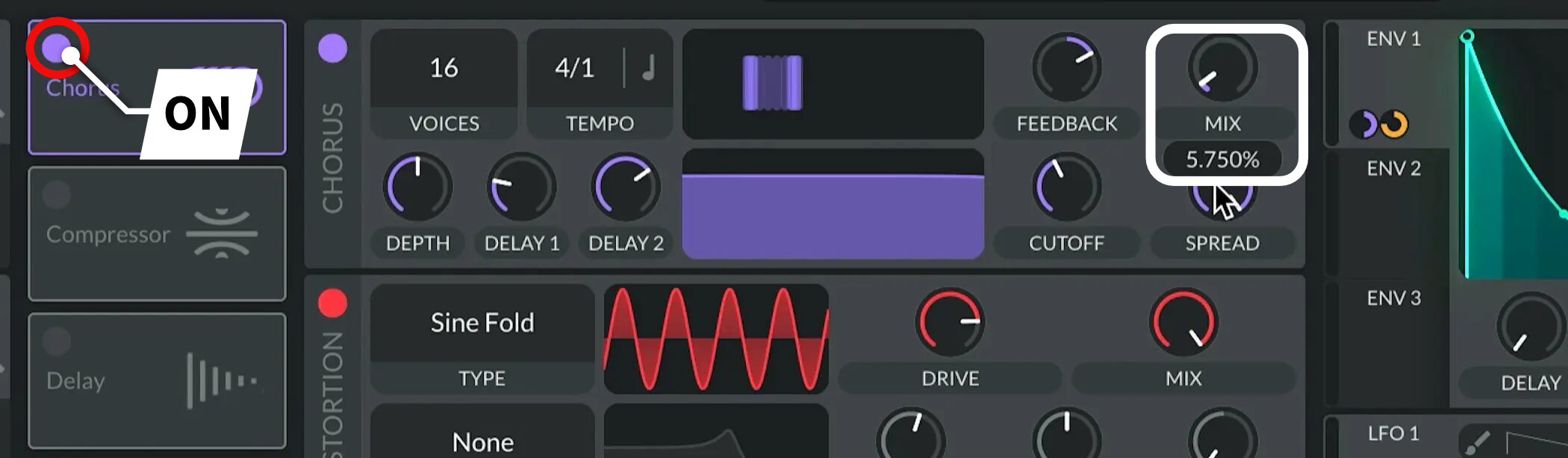 Chorusをオンにし、MIXを5%と少なめに設定し、わずかに広がりを追加します。