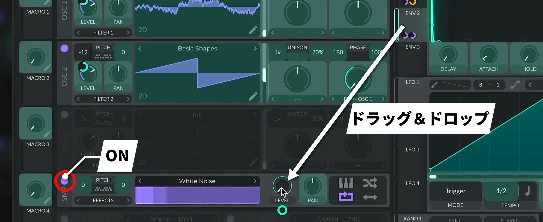 さらにSMP(ノイズオシレーター)をオンにし、SMPのLEVELにもENV2を割り当てます。
