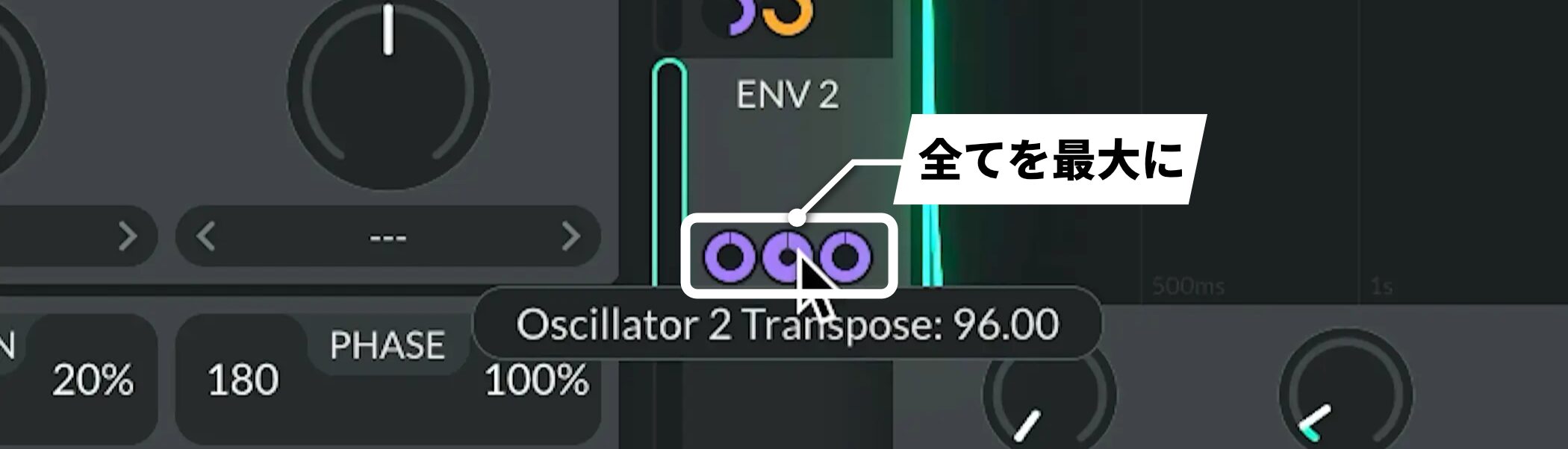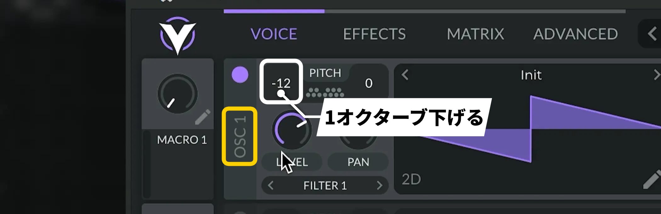 OSC1のTransposeを-12に設定して、1オクターブ下げます。