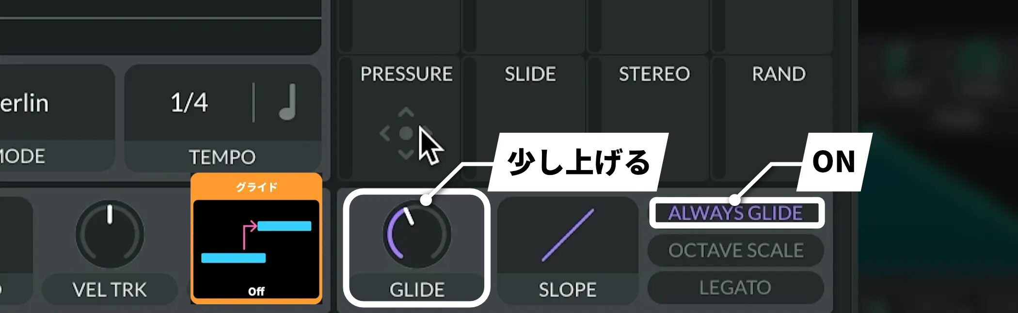 滑らかな繋がりにしたいので、ALWAYS GLIDEをONにし、GLIDEを少し上げておきましょう。